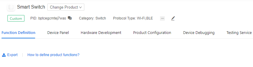 You will notice 6 tabs namely Function Definition, Device Panel, Hardware Development, Product Configuration, Device Debugging, and Testing Service.
